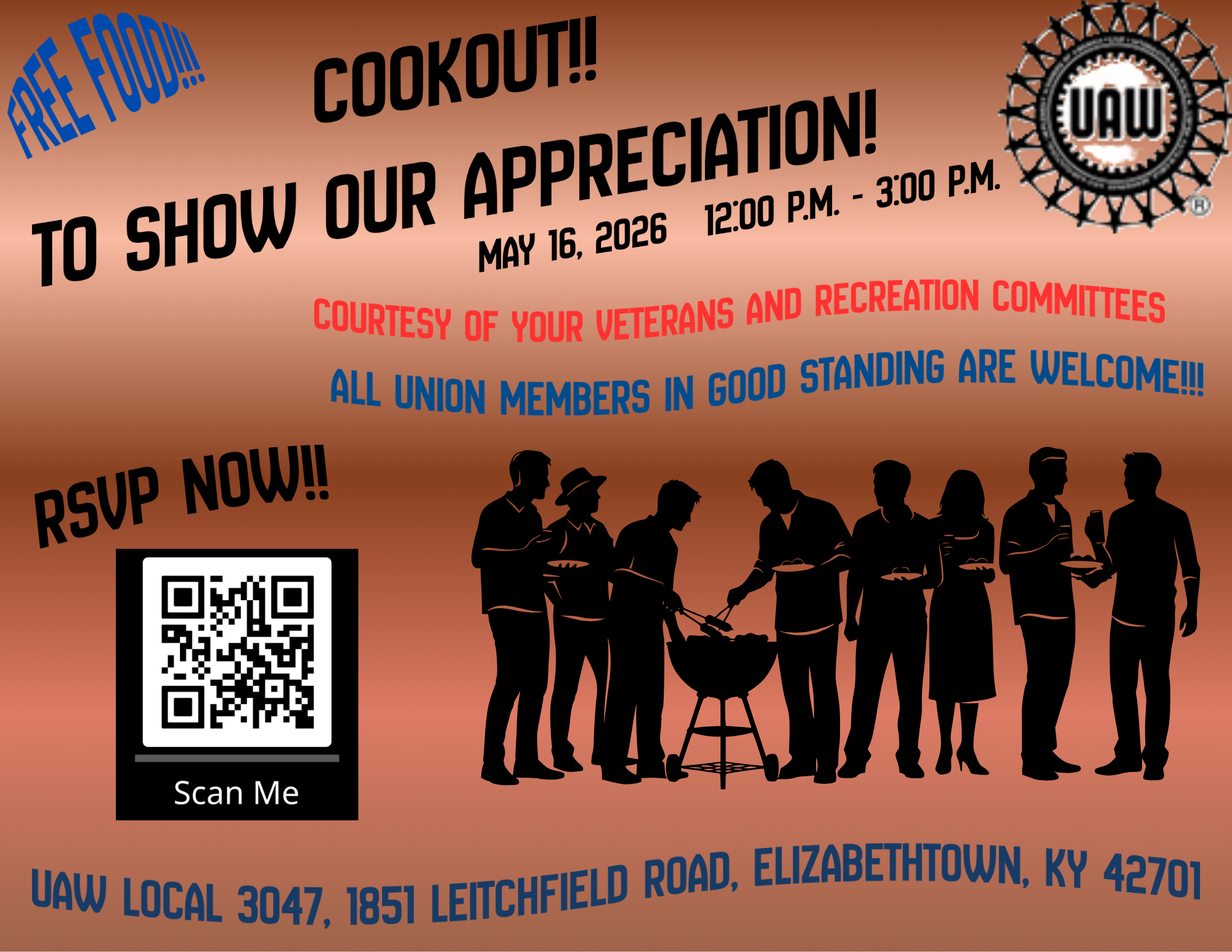**UNION MEETING** 2026 UAW Appreciation Cookout! May 16, 2026 12:00PM - 3:00PM Social share icons Scan the QR code to join us on May 16 for the Appreciation Cookout!