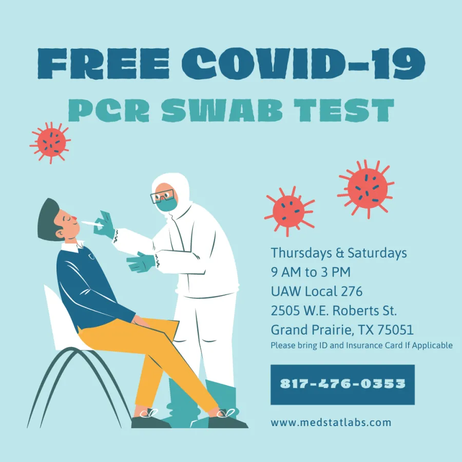 We will be hosting Medstat Labs for FREE COVID-19 testing on Thursdays and Saturdays from 9:00 AM to 3:00 PM at the Union Hall (2505 W E Roberts Street, Grand Prairie, TX 75051). The testing will take place outside of our main building. Please bring your ID and insurance card, if applicable.