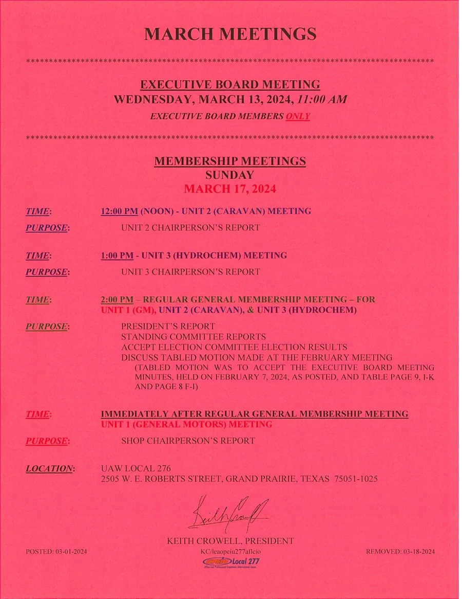 TIME:                      IMMEDIATELY AFTER REGULAR GENERAL MEMBERSHIP MEETING UNIT 1 (GENERAL MOTORS) MEETING