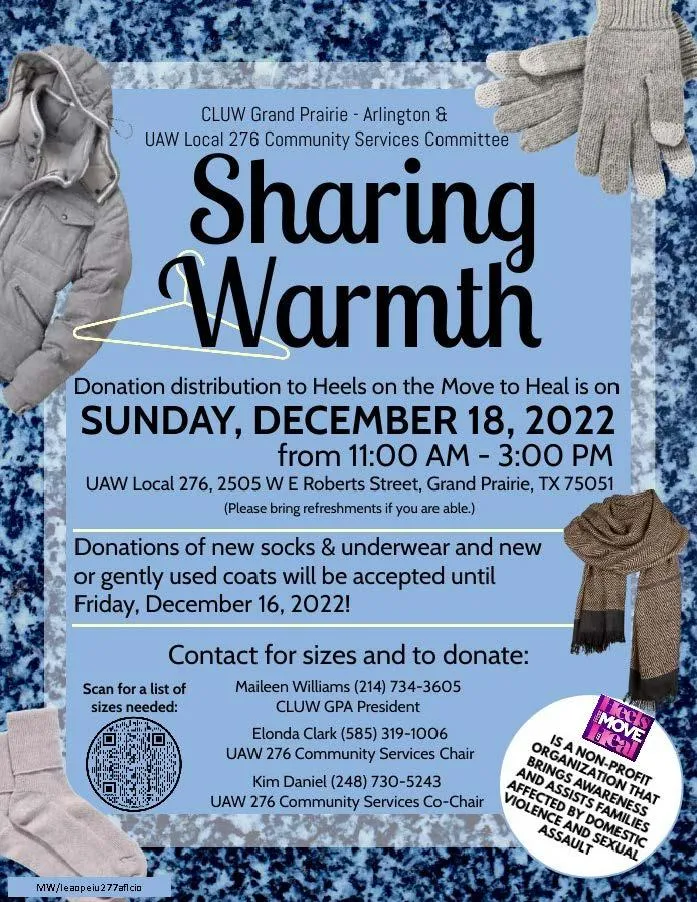 Donation distribution to Heels on the Move to Heal is on Sunday, December 18, 2022, from 11:00 AM – 3:00 PM at UAW Local 276, 2505 W. E. Roberts Street, Grand Prairie, TX 75051. Please bring refreshments if you are able.