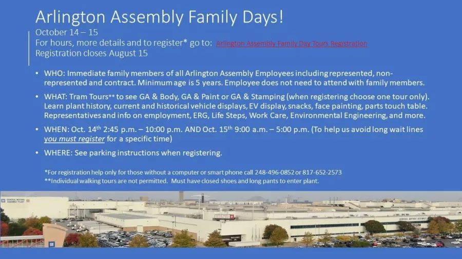 Arlington Assembly and UAW Local 276 look forward to welcoming your family to see and learn about how our vehicles are made.